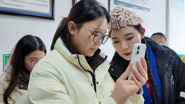 第十四届全国政协委员、非遗传承人杨钰尼(右)参与广东财经大学助农活动。叶澜/摄